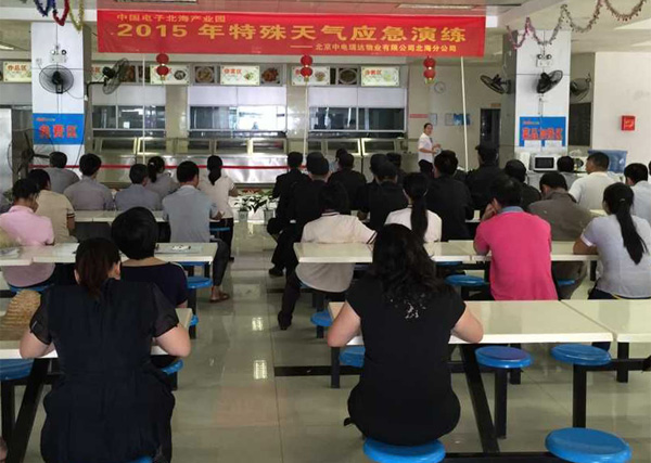 因北海天氣多變,特殊天氣隨時(shí)可能發(fā)生,為防止隨時(shí)可能出現(xiàn)的特殊天氣對(duì)園區(qū)安全帶來(lái)不利影響,確保園區(qū)設(shè)備財(cái)產(chǎn)的正常運(yùn)轉(zhuǎn)、安全,確保園區(qū)安全生產(chǎn)零事故,同時(shí)為讓員工熟悉應(yīng)對(duì)特殊天氣的工作流程,做到工作有計(jì)劃性、準(zhǔn)備工作及時(shí)到位、突發(fā)事件處理及時(shí),園區(qū)物業(yè)公司(中電瑞達(dá))于2015年6月9日下午,組織公司全體人員開(kāi)展了一次特殊天氣應(yīng)急演練。整個(gè)演練分為:特殊天氣應(yīng)急預(yù)案培訓(xùn)、特殊天氣應(yīng)急演練兩大部分。為確保此次演練順利進(jìn)行,物業(yè)公司積極準(zhǔn)備,專(zhuān)門(mén)組織各部門(mén)負(fù)責(zé)人召開(kāi)專(zhuān)題會(huì)議,完善方案、物資準(zhǔn)備,部署每個(gè)演練環(huán)節(jié),明確人員分工、時(shí)間節(jié)點(diǎn)、演練流程。