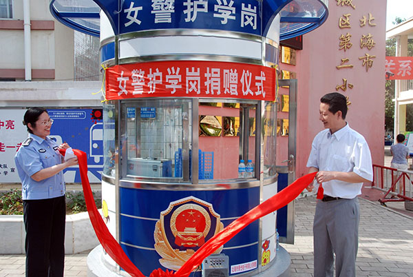 近日,市公安局交警支隊女警護衛(wèi)崗捐贈儀式在海城區(qū)二小門前舉行。北海景光電子有限公司向交警支隊捐贈了兩個女警護衛(wèi)崗亭,價值達4.6萬元,用實際行動支持百萬學生文明交通暨“護衛(wèi)天使行動”創(chuàng)建工作。據(jù)了解,目前全市共有三個護學崗,其中女警護學崗兩個,在每天學生上學放學的高峰期,在校門口路段指揮疏導交通,引導護送學生安全有序地橫過道路,確保校園周邊道路交通秩序井然。
